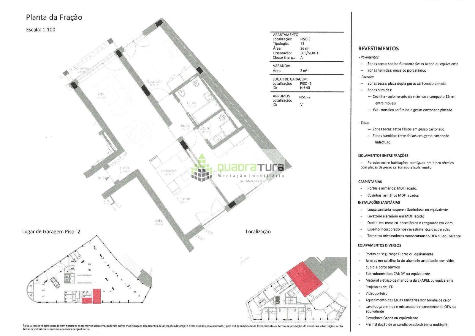 - Zonas húmidas: cozinha - aglomerado de mármore compacto entre móveis, Casas de banho - mosaico porcelânico e gesso cartonado pintado