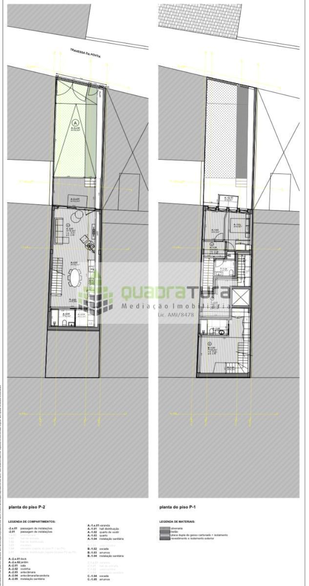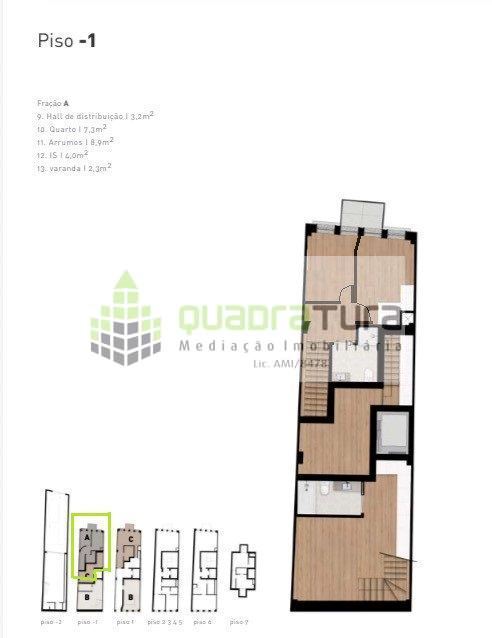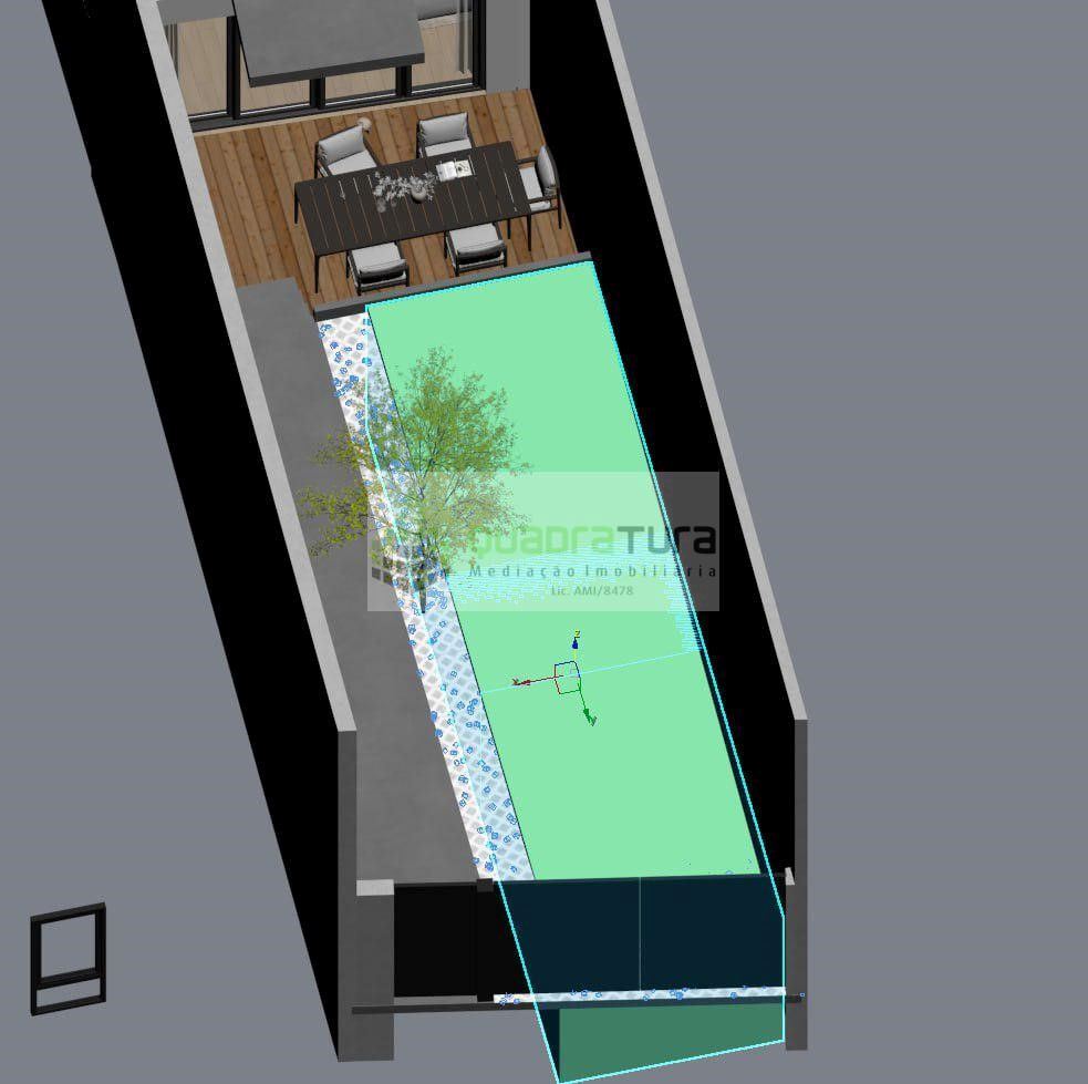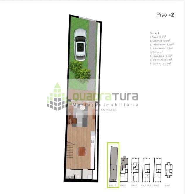 Esta fração T1+1, é constituída por 2 pisos, com um jardim de 45m2 no piso inferior e uma varanda no piso superior.