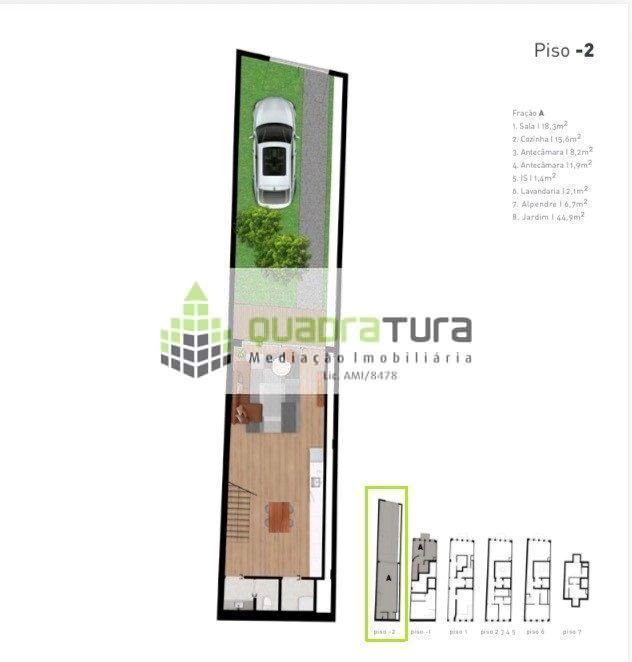 Esta fração T1+1, é constituída por 2 pisos, com um jardim de 45m2 no piso inferior e uma varanda no piso superior.