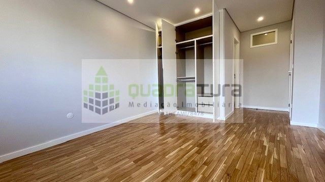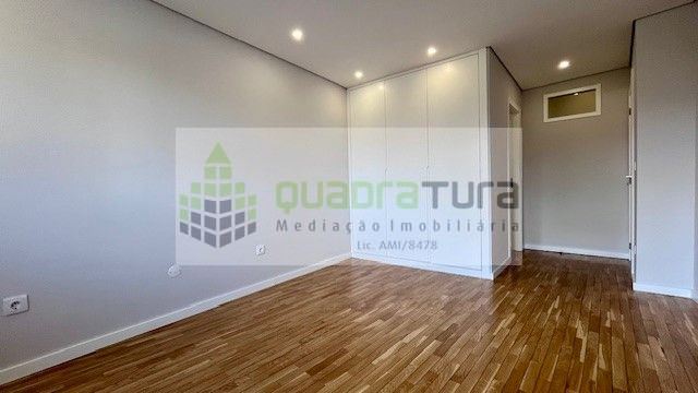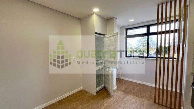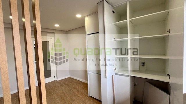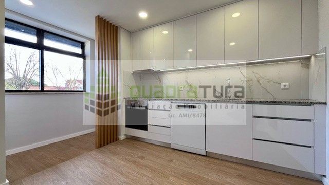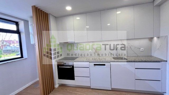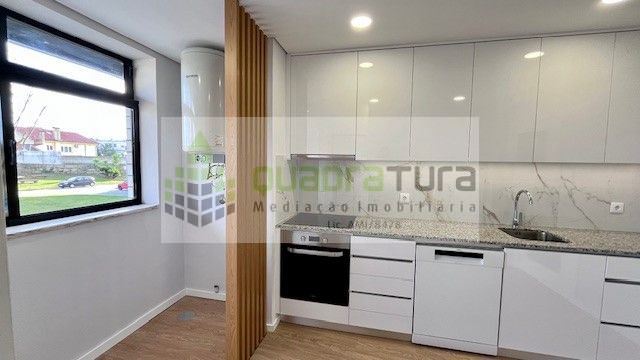 A cozinha equipada, conta com exaustor, placa, forno, máquina de lavar louça e frigorifico combinado, com móveis lacados em branco e pavimento cerâmico, dispõe ainda de lavandaria.