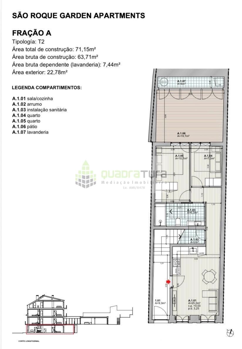é um empreendimento residencial com 377,7m² de área construída, dividido em 5 frações (T1 e T2) e 42,5m² de áreas comuns.