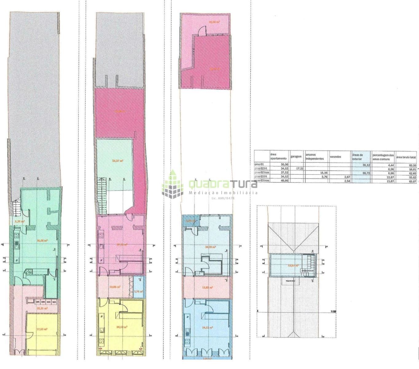 3º PISO Frente = apartamento c/ 34,52m2 de área + 3,76m2 de Arrumos independentes + 2,87m2 de Varanda