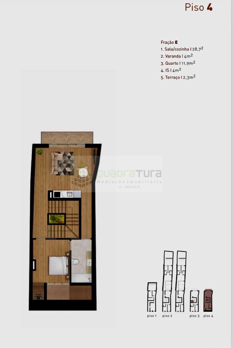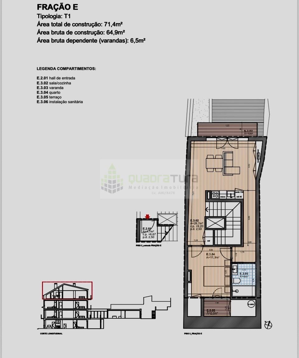 é um empreendimento residencial com 377,7m² de área construída, dividido em 5 frações (T1 e T2) e 42,5m² de áreas comuns.